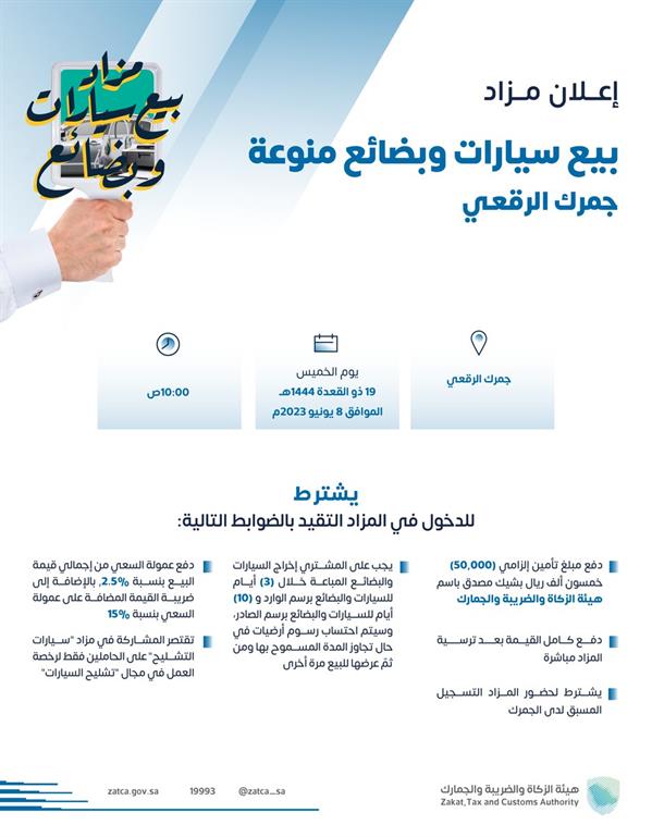 أعلنت هيئة الزكاة والضريبة والجمارك إقامة مزاد علني لبيع سيارات وبضائع منوعة في جمرك الرقعي، وذلك يوم الخميس 8 يونيو المقبل.