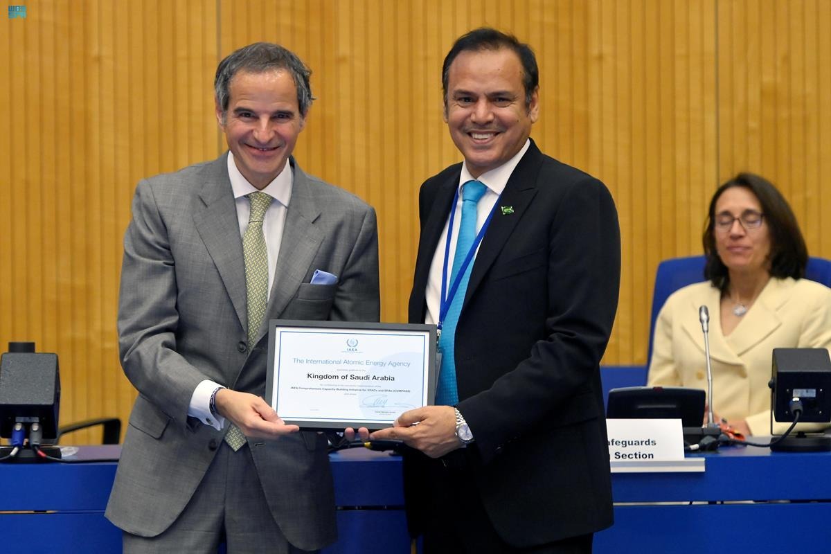 وقام بتسليم الشهادة مدير عام الوكالة للطاقة الذرية رفائيل قروسي، لممثل هيئة الرقابة النووية والإشعاعية جلوي بن ناصر القحطاني في مقر الوفد الدائم للمملكة في فيينا لدى الوكالة.