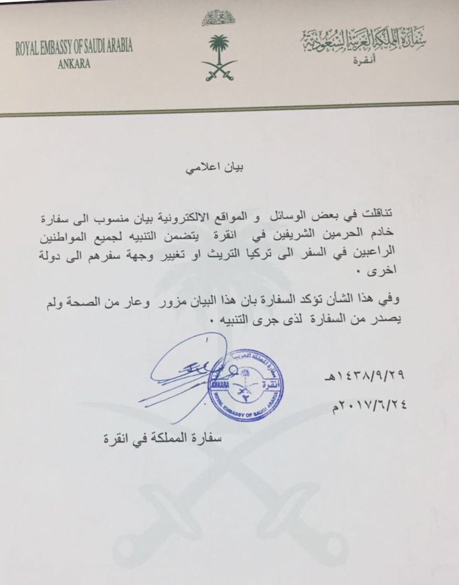 وقالت السفارة في بيان لها قبل قليل إنه بخصوص البيان المتداول والذي يتضمن تحذير السفارة راغبي السفر لتركيا وحثهم على التريث أو تغيير الوجهة هو بيان مزور وعار تمامًا من الصحة.