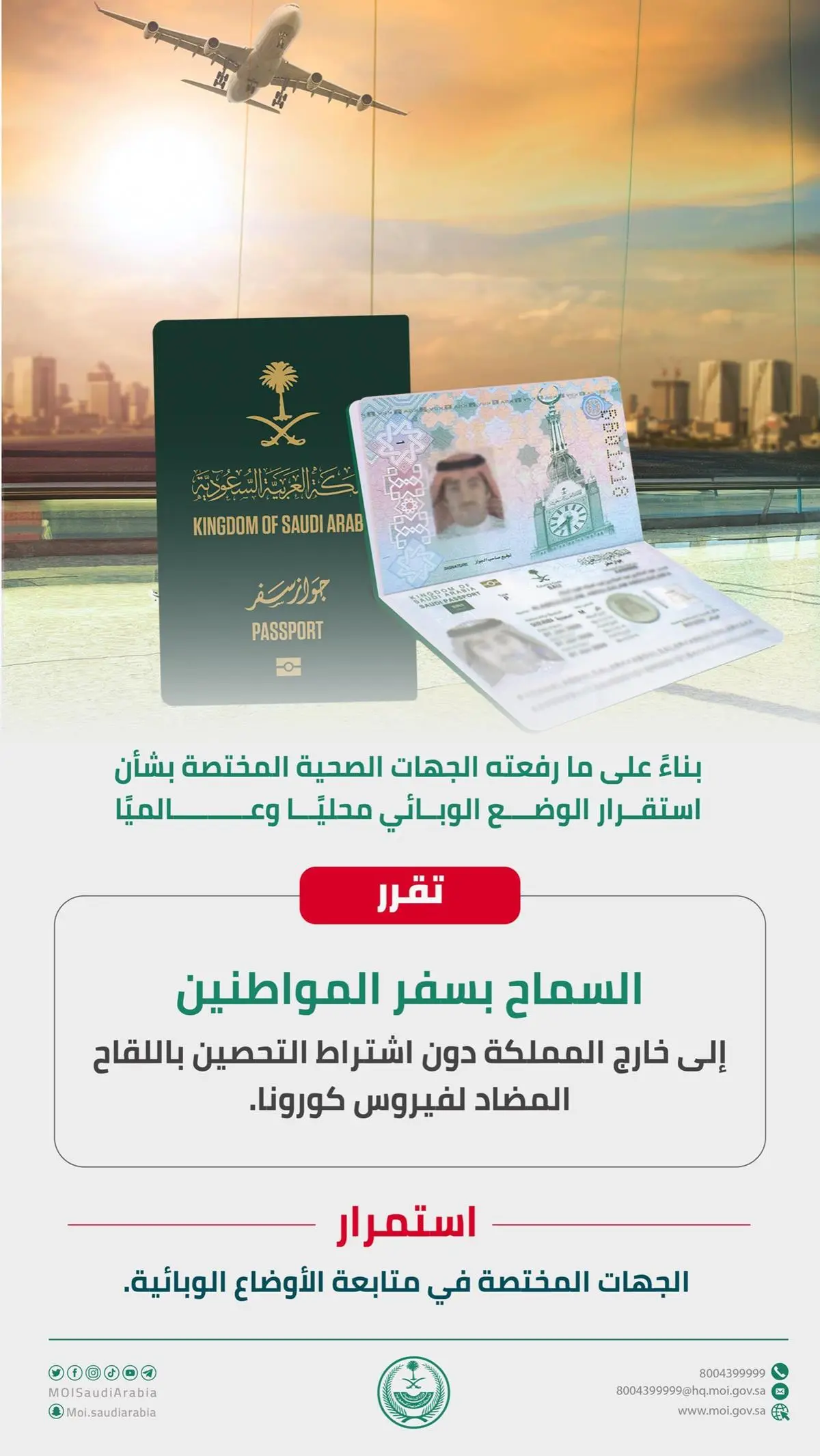 صرح مصدر مسؤول في وزارة الداخلية، بأنه بناءً على ما رفعته الجهات الصحية المختصة بشأن استقرار الوضع الوبائي محليًا وعالميًا بفضل الله ثم الدعم غير المحدود من القيادة الرشيدة، فقد تقرر السماح بسفر المواطنين إلى خارج المملكة دون اشتراط التحصين باللقاح المضاد لفيروس كورونا، مع استمرار الجهات المختصة في متابعة الأوضاع الوبائية.