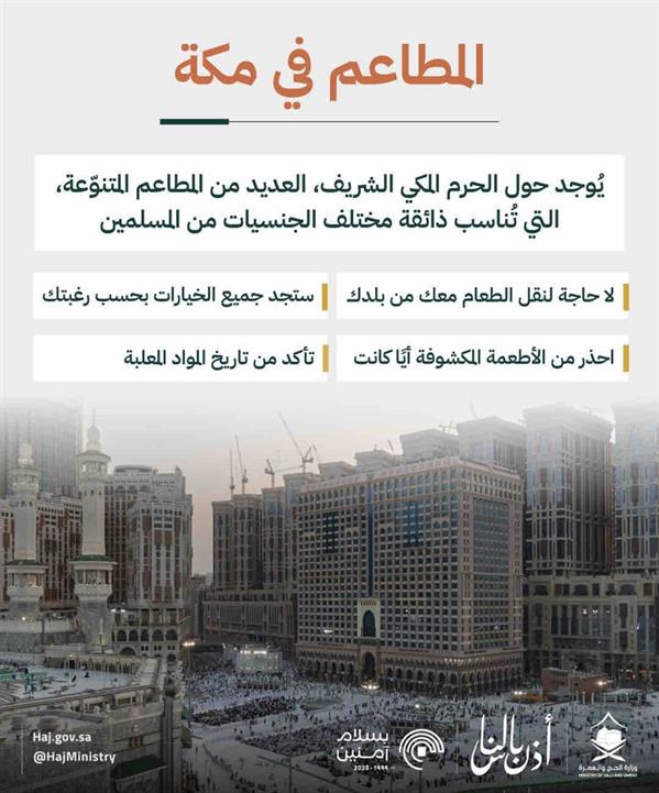 قدّمت وزارة الحج والعمرة، مجموعة من الإرشادات والنصائح للحجاج حول كيفية تناول غذاء صحي، محذرةً من تناول الأطعمة المكشوفة.