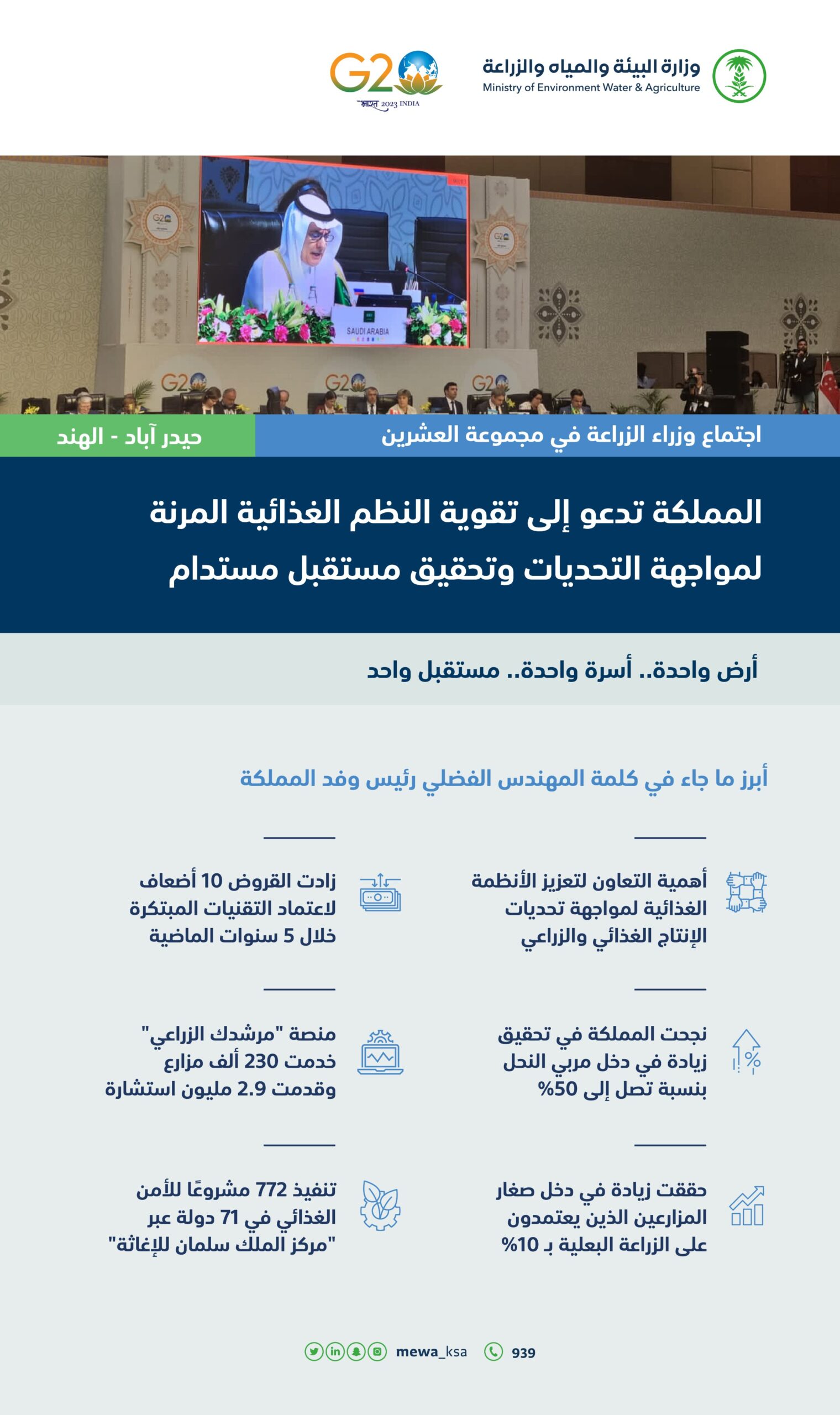 المملكة تدعو دول "العشرين" إلى التعاون من أجل تقوية النظم الغذائية المرنة لمواجهة التحديات وتحقيق مستقبل مستدام