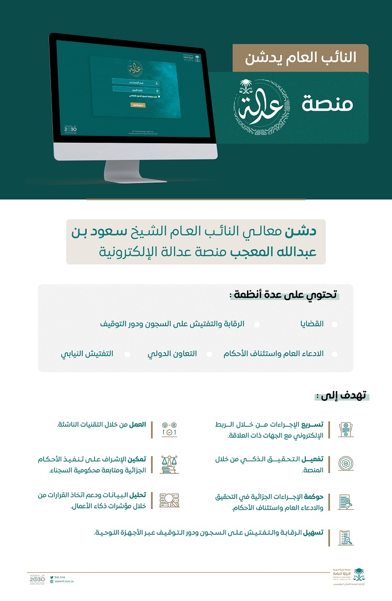 الجدير بالذكر أن الحوكمة النيابية الإلكترونية بدأت منذ عام ۲۰۱۷م، ويأتي هذا التحول الإلكتروني الحالي عبر منصة عدالة إيماناً من النيابة العامة بأهمية تطوير أنظمتها الإلكترونية لمواكبة رؤية المملكة ۲۰۳۰م.