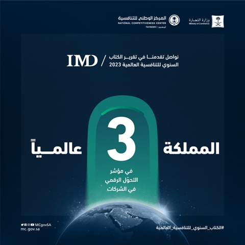 حققت المملكة انجازاً جديداً بحلولها في المرتبة الثالثة عالمياً في مؤشر التحول الرقمي للشركات الصادر ضمن تقرير الكتاب السنوي للتنافسية العالمية IMD لعام 2023م.