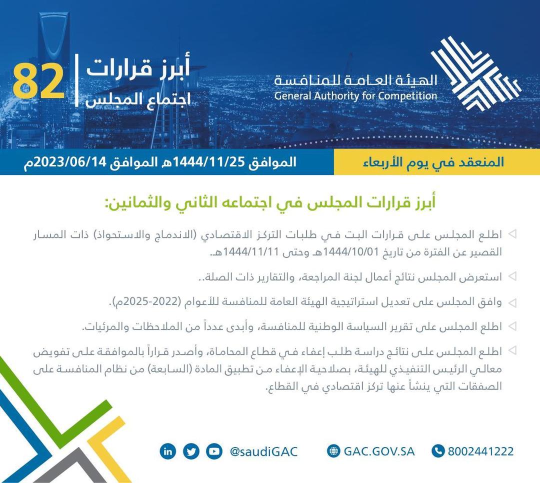 واستعرض المجلس عددًا من الموضوعات المدرجة على جدول أعماله، وأصدر في ضوئها عددًا من القرارات والتوجيهات أبرزها : البت في طلبات التركز الاقتصادي “الاندماج والاستحواذ” ذات المسار القصير عن الفترة من تاريخ 01/10/1444هـ وحتى 11/11/1444هـ .