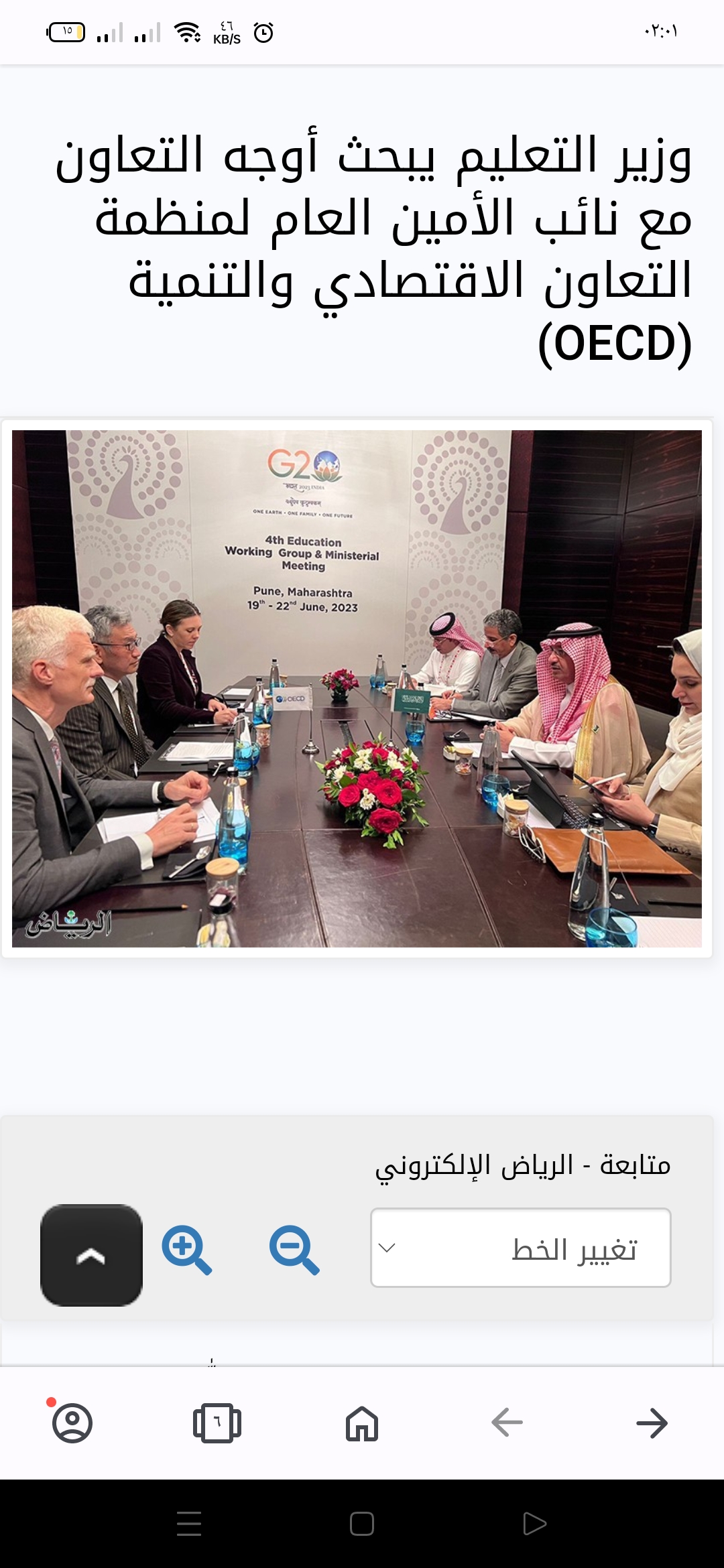 بحث وزير التعليم يوسف بن عبدالله البنيان مع معالي نائب الأمين العام لمنظمة التعاون الاقتصادي والتنمية (OECD)؛ أوجه التعاون القائم بين المملكة والمنظمة، وذلك في إطار اجتماع وزراء التعليم في مجموعة العشرين خلال سنة الرئاسة الهندية للمجموعة للعام الجاري 2023م.