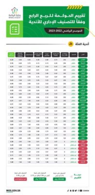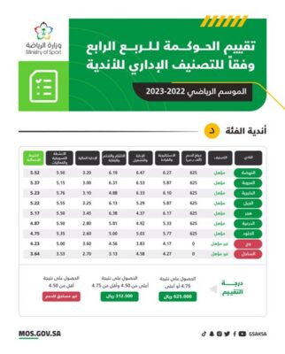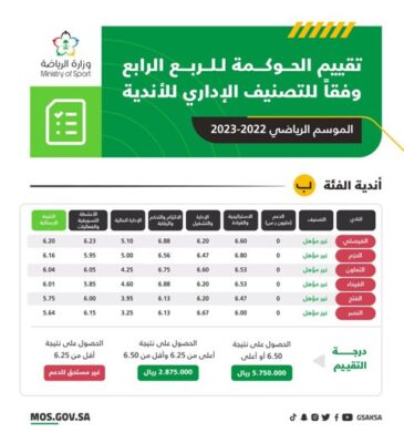 أعلن فريق استراتيجية دعم الأندية في وزارة الرياضة، عن نتائج تقييم الحوكمة للربع الرابع من الموسم الرياضي 2022-2023، وفقًا للتصنيف الإداري للأندية.