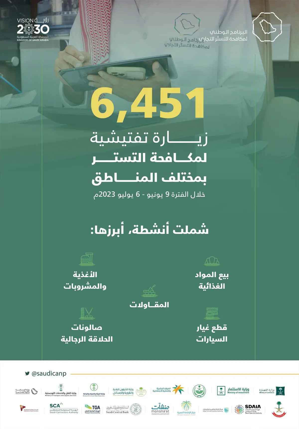 نفذ البرنامج الوطني لمكافحة التستر التجاري (6,451) زيارة تفتيشية لمكافحة التستر بمختلف مناطق المملكة خلال الفترة 9 يونيو – 6 يوليو 2023م.