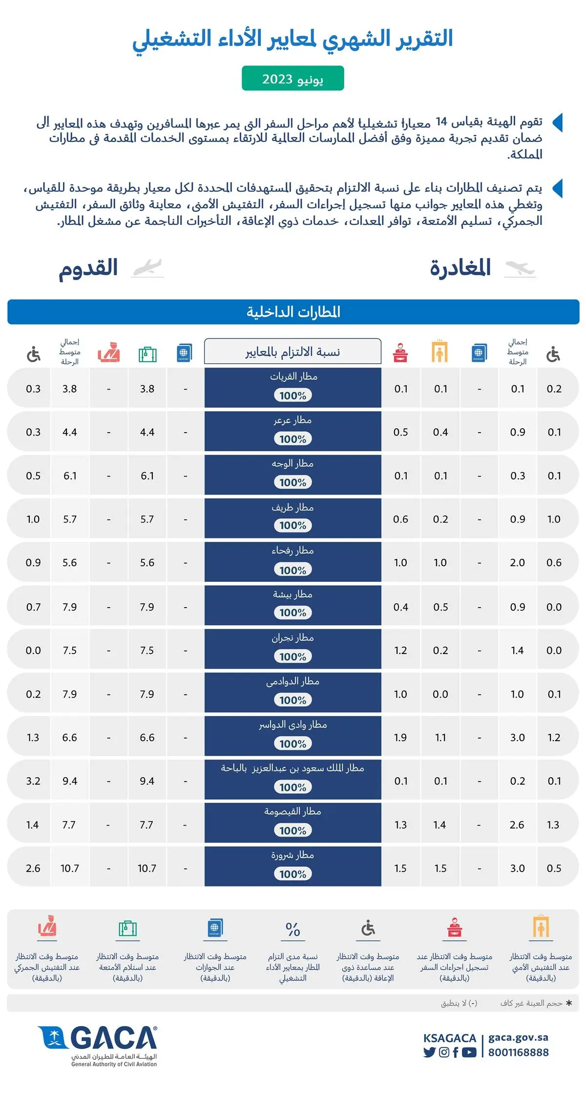 أصدرت الهيئة العامة للطيران المدني اليوم، تقريرها الشهري عن أداء مطارات المملكة الدولية والداخلية، لشهر يونيو 2023م، وفقاً لأربعة عشر معياراً أساسياً لقياس الأداء، وذلك تطبيقاً للتوجُّهات الإستراتيجية التي تستهدف تجويد الخدمات المُقدَّمة للمسافرين، ورفع مستواها، وتحسين تجربة المسافر في مطارات المملكة.