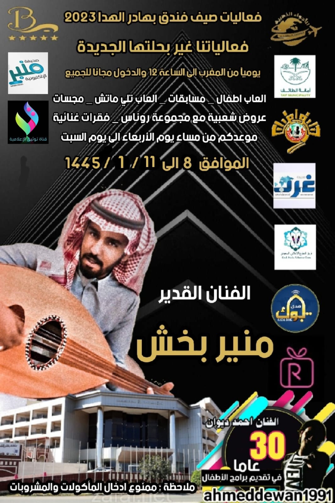 كرمت إدارة فندق بهادر الهدا والأجواء الذهبية الرعاة الداعمين الإعلاميين بمناسبة إفتتاح فعالياتها لصيف هذا العام 2023 بحلتها الجديدة ضمن فعاليات صيف الطائف بحضور رئيس مجلس إدارة فندق بهادر الهدا الشيخ خليل عبدالرحمن بهادر ونائبة رئيس مجلس إدارة فندق بهادر الشيخة عبير رمضان ورئيس مجلس ادارة الاجواء الذهبية الشيخ سلطان زايد بمشاركة مجموعة الليالي الفنية ومشاركة الفنان القدير حسن التواتي والفنان صالح التواتي