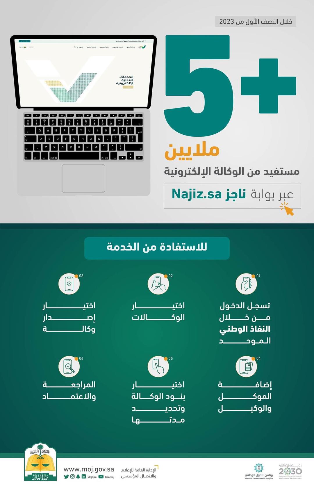كشفت وزارة العدل عن إجمالي عدد المستفيدين من خدمة الوكالات الإلكترونية الصادرة عبر بوابة ناجز najiz.sa خلال النصف الأول من العام الجاري 2023، إذ بلغ أكثر من 5 ملايين مستفيد.