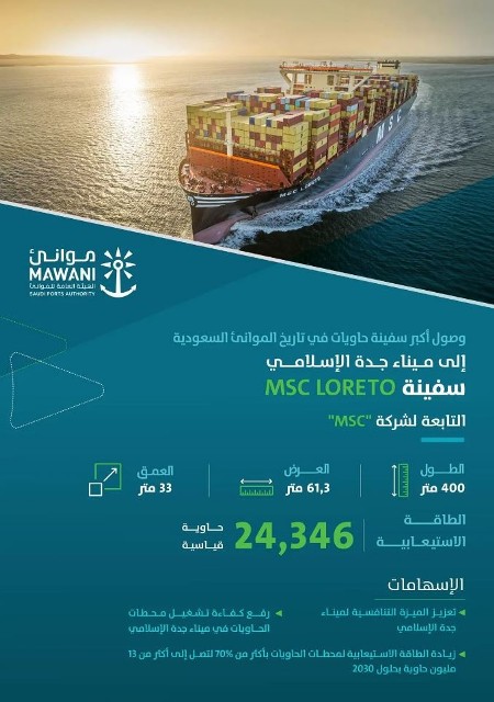 ويعزز وصول السفينة الضخمة إلى ميناء جدة الإسلامي من ميزته التنافسية، ويؤكد تطور البنية التحتية له التي تؤهله لاستقبال سفن الحاويات العملاقة، إذ شهد ضمن عمليات التطوير تعميق قناتي الاقتراب وحوض الدوران والممرات البحرية وحوض المحطة الجنوبية، إضافة إلى عمليات التوسعة المستمرة، وعقود الإسناد التجاري، التي أسهمت في رفع كفاءة تشغيل محطات الحاويات بالميناء، وزيادة الطاقة الاستيعابية لمحطات الحاويات بأكثر من 70% لتصل إلى أكثر من 13 مليون حاوية بحلول 2030. وتنقل السفينة “MSC LORETO” مجموعة واسعة من البضائع من المواد الخام إلى المنتجات النهائية، مثل الآلات والبلاستيك والمطاط والإلكترونيات والأثاث، وهي جزء من سلسلة من 6 سفن عملاقة، كما أنها مجهزة بتقنيات وميزات حديثة تجعلها فعالة في استخدام الطاقة والوقود.