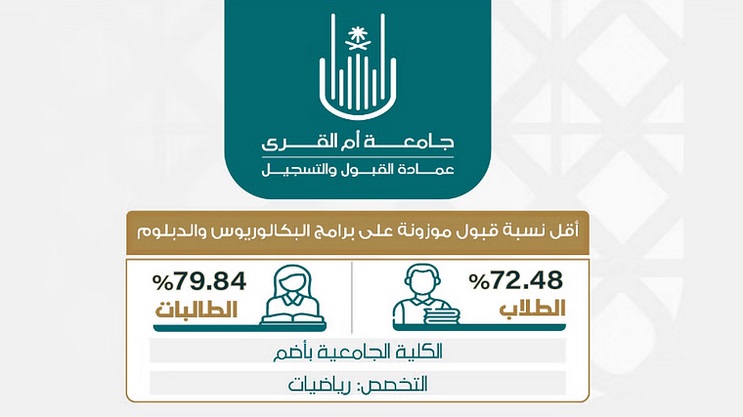وحددت أقل نسبة للقبول للطلاب 72,48% والطالبات 79,84% للكلية الجامعية بأضم تخصص رياضيات.