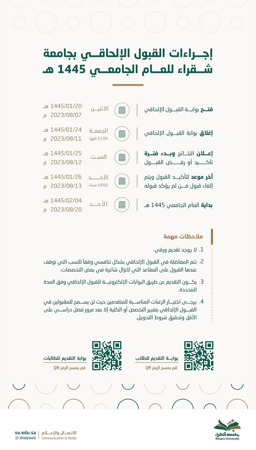 أعلنت جامعة شقراء عن إتاحة الفرصة للطلاب والطالبات للقبول الإلحاقي من خلال بوابة القبول الإلكتروني، للتقديم على المقاعد الشاغرة بكليات الجامعة للعام الجامعي ١٤٤٥هـ.