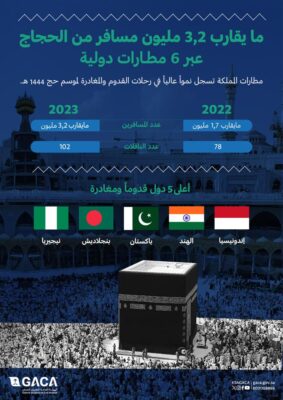 وأضافت الهيئة أن أعداد الركاب خلال موسم الحج لهذا العام، شهدت ارتفاعًا كبيرًا بأكثر من 86% عن عام 2022م، مما يعد مؤشراً واضحاً على النمو الكبير لأعداد الحجاج المسافرين عبر مطاراتها الدولية.