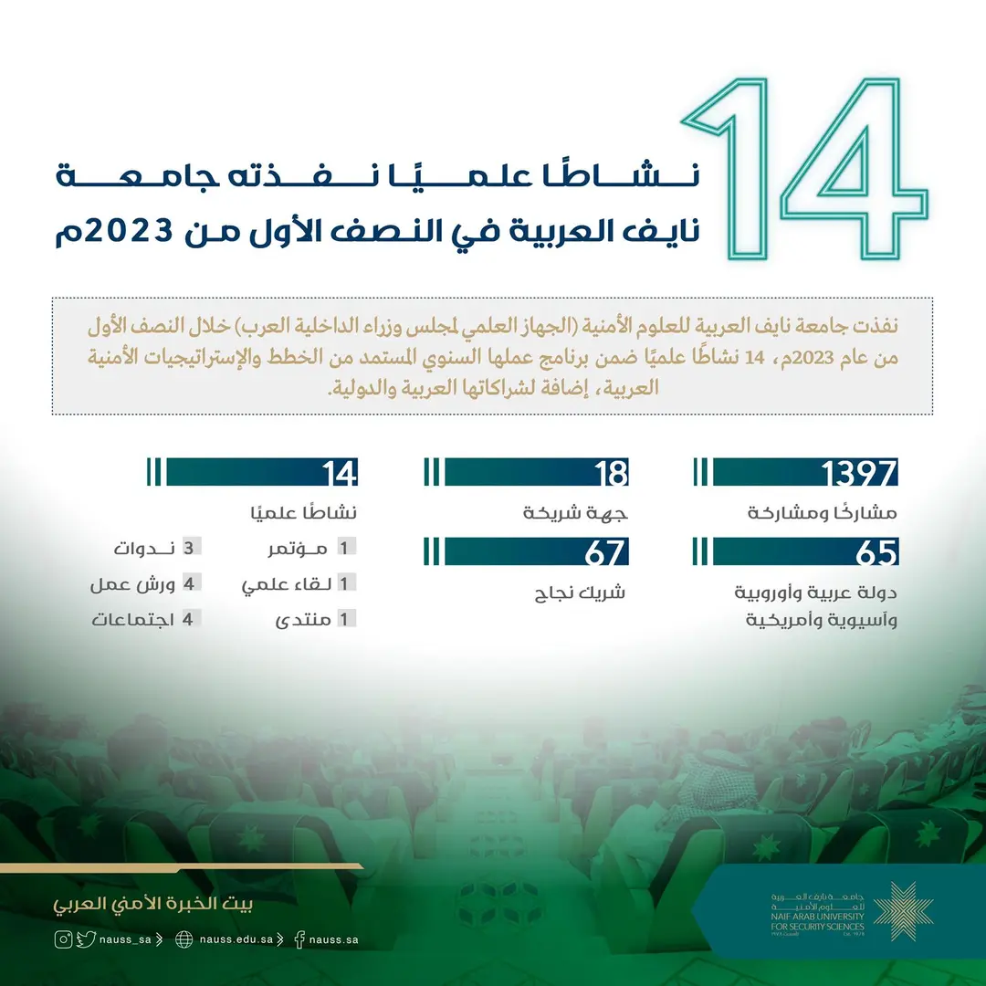 نفذت جامعة نايف العربية للعلوم الأمنية، خلال النصف الأول من عام 2023م، 14 نشاطًا علميًا ضمن برنامج عملها السنوي المنبثق من خطتها الإستراتيجية 2019 ـ 2023م، ومن الخطط الإستراتيجية والمرحلية الأمنية العربية، إضافة لشراكاتها العربية والدولية، حيث اشتملت النشاطات على عدد من المؤتمرات واللقاءات، والحلقات العلمية، والندوات، وورش العمل شارك فيها حضوريًا وعبر تقنية الاتصال المرئي أكثر من 1397 مشاركًا ومشاركة، يمثلون 65 دولة عربية، وآسيوية، وأوروبية، وأمريكية، بالتعاون مع 18 جهة شريكة، و67 شريك نجاح، وذلك في إطار سعي الجامعة (الجهاز العلمي لمجلس وزراء الداخلية العرب) لتكامل الجهود المشتركة في مجال مكافحة الجريمة، ودعم ميادين العدالة الجنائية في الدول العربية، كمؤسسة أولى في إعداد القادة والخبراء العرب، وبيت خبرة مرجعي في المجالات الأمنية والعدلية، بما يدعم القرار وبناء السياسات الأمنية الفعالة تجاه أهم المهددات الأمنية عربيًا ودوليًا.