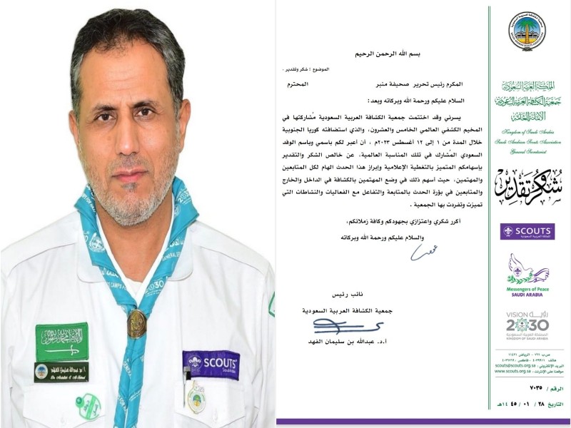 كرمت جمعية الكشافة العربية السعودية، صحيفة “منبر” الإلكترونية لمشاركتها الفعالة في تغطية أعمال الجمعية خلال مشاركتها في المخيم الكشفي العالمي الخامس والعشرون، والذي استضافته كوريا الجنوبية خلال المدة من ١ إلى ١٢ أغسطس ٢٠٢٣م.