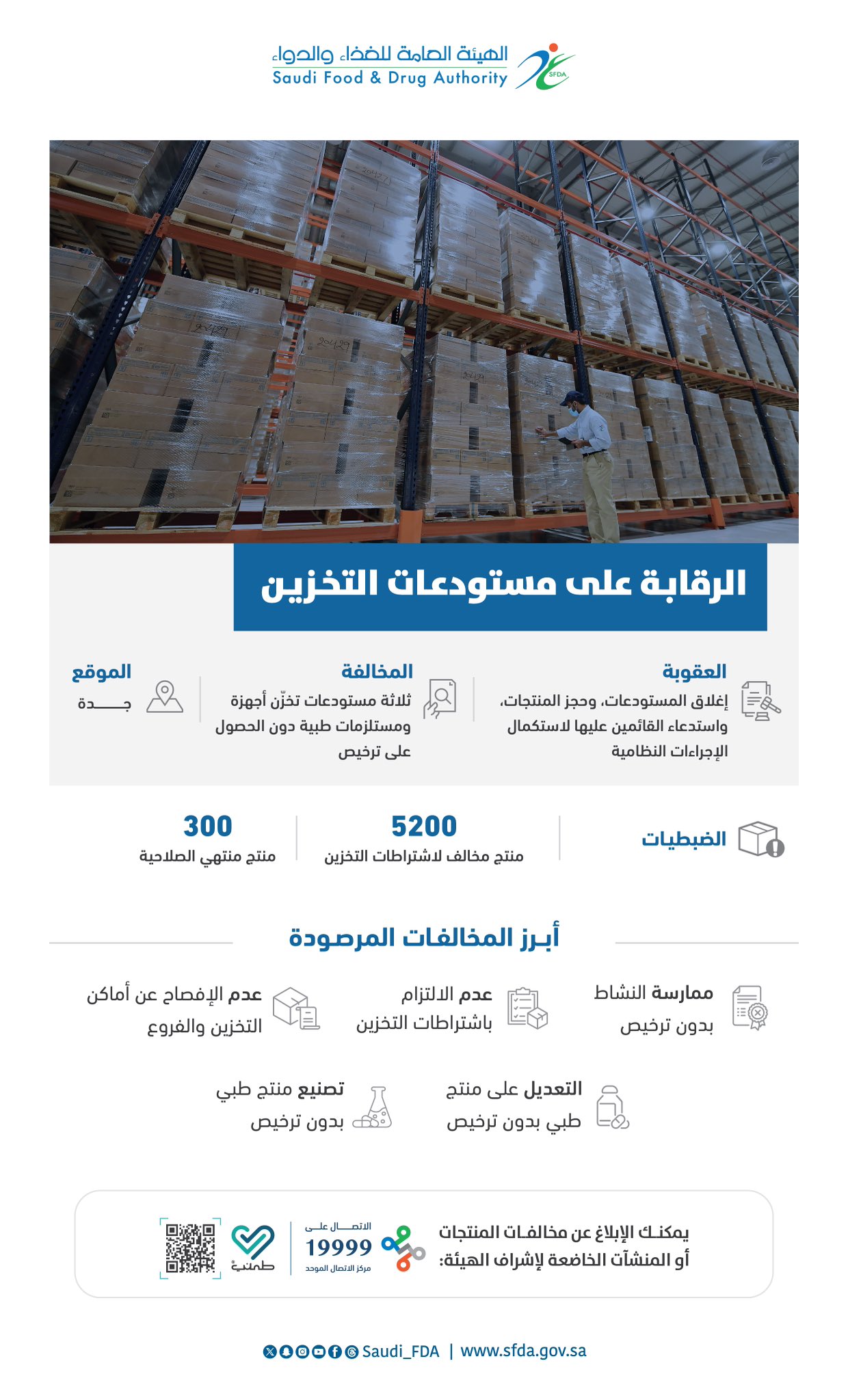 “الغذاء والدواء”: إغلاق 3 مستودعات مخالفة وضبط 5500 منتجٍ طبي في جدة