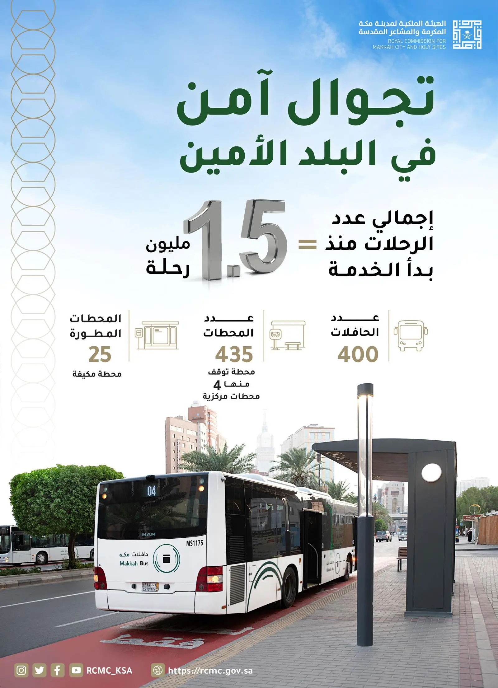 أعلنت الهيئة الملكية لمدينة مكة المكرمة والمشاعر المُقدسة – اليوم – عن تحقيق مشروع حافلات مكة أثناء الفترة التشغيلية التجريبية لمليون ونصف رحلة.