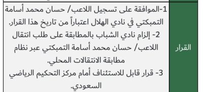 وأعلنت لجنة الاحتراف وأوضاع اللاعبين في الاتحاد السعودي لكرة القدم الموافقة على تسجيل اللاعب حسان تمبكتي لصالح الهلال اعتبارً من تاريخ الأحد 27 أغسطس وإلزام الشباب بالمطابقة على طلب انتقال اللاعب عبر نظام مطابقة الانتقالات المحلي.