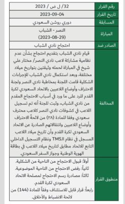 رفضت لجنة الانضباط والأخلاق في الاتحاد السعودي لكرة القدم، الإثنين، احتجاج نادي الشباب على عدم نظامية مشاركة مختار علي لاعب فريق النصر الأول، خلال مواجهة الفريقين التي كسبها الأصفر برباعية نظيفة، في قمة مباريات الجولة الرابعة من دوري روشن السعودي.