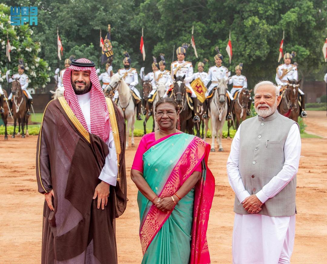 بعد ذلك عزف السلامان الملكي السعودي والجمهوري الهندي، ثم استعرض حرس الشرف.