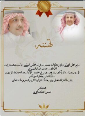 تلقى الأستاذ الدكتور حامد بن محمد الشمراني سيلاً من التهاني والتبريكات بعد صدور قرار المجلس العلمي بجامعة بيشة بترقيته إلى درجة أستاذ دكتور (بروفيسور) في تخصص الإدارة والتخطيط التربوي.