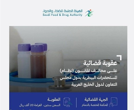 وأكدت أن حيازة وتصنيع وتركيب وتسويق أي مستحضر بيطري دون الحصول على التراخيص النظامية اللازمة، يعد مخالفًا لأحكام قانون نظام المستحضرات البيطرية بدول مجلس التعاون لدول الخليج العربية ولائحته التنفيذية، استناداً لما نصت عليه المادة (27) من النظام، بأن “كل من خدع أو غش في المستحضر البيطري أو شرع في ذلك، أو باع أو حاز أو صنع أو ركّب مستحضرًا بيطريًا مغشوشًا أو فاسدًا أو منتهي الصلاحية أو مخالفًا لبيانات المستحضر، أو صنع أو طبع أو حاز أو باع أو عرض عبوات أو أغلفة لمستحضر بيطري معين بقصد الغش يعد من الأفعال المخالفة”.