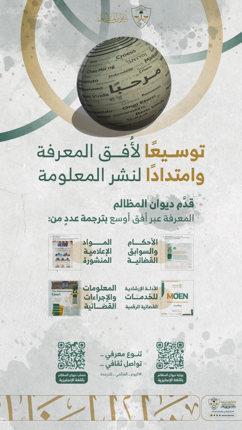 يذكر أن ديوان المظالم يعمل على ترجمة الأنظمة واللوائح والأحكام والسوابق القضائية، إضافة إلى الرسائل الإعلامية وما في سياقها من الأدلة الإرشادية والمعلومات والإجراءات القضائية الرقمية. كما يقوم الفريق المسؤول بترجمة شاملة لمواد ديوان المظالم المنشورة، بين رسائل إعلامية وإخبارية ومواد توعوية وقانونية، وبلغات متعددة، من خلال حسابه الرسمي في منصة “إكس” الرقمية، ونشر التوعية القضائية باللغة الإنجليزية.