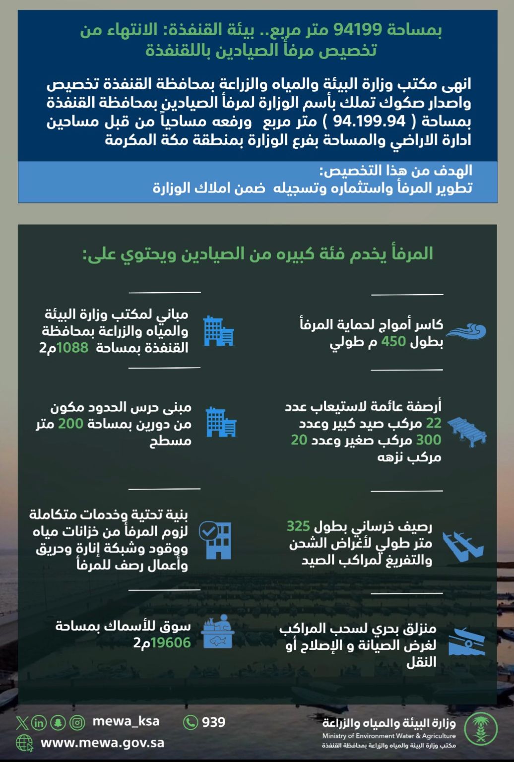 وفي التفاصيل اوضح مدير مكتب وزارة البيئة والمياه والزراعة بمحافظة القنفذة المهندس حسن بن ابراهيم المعيدي ، ان المرفأ يخدم فئة كبيره من الصيادين ويحتوي على بنية تحتيه وخدمات متكاملة . بالاضافة الى مباني لمكتب الوزارة بمساحة 1088م2 ، ومبنى لحرس الحدود المكون من دورين ، وسوق للأسماك بمساحة 19606م2 .