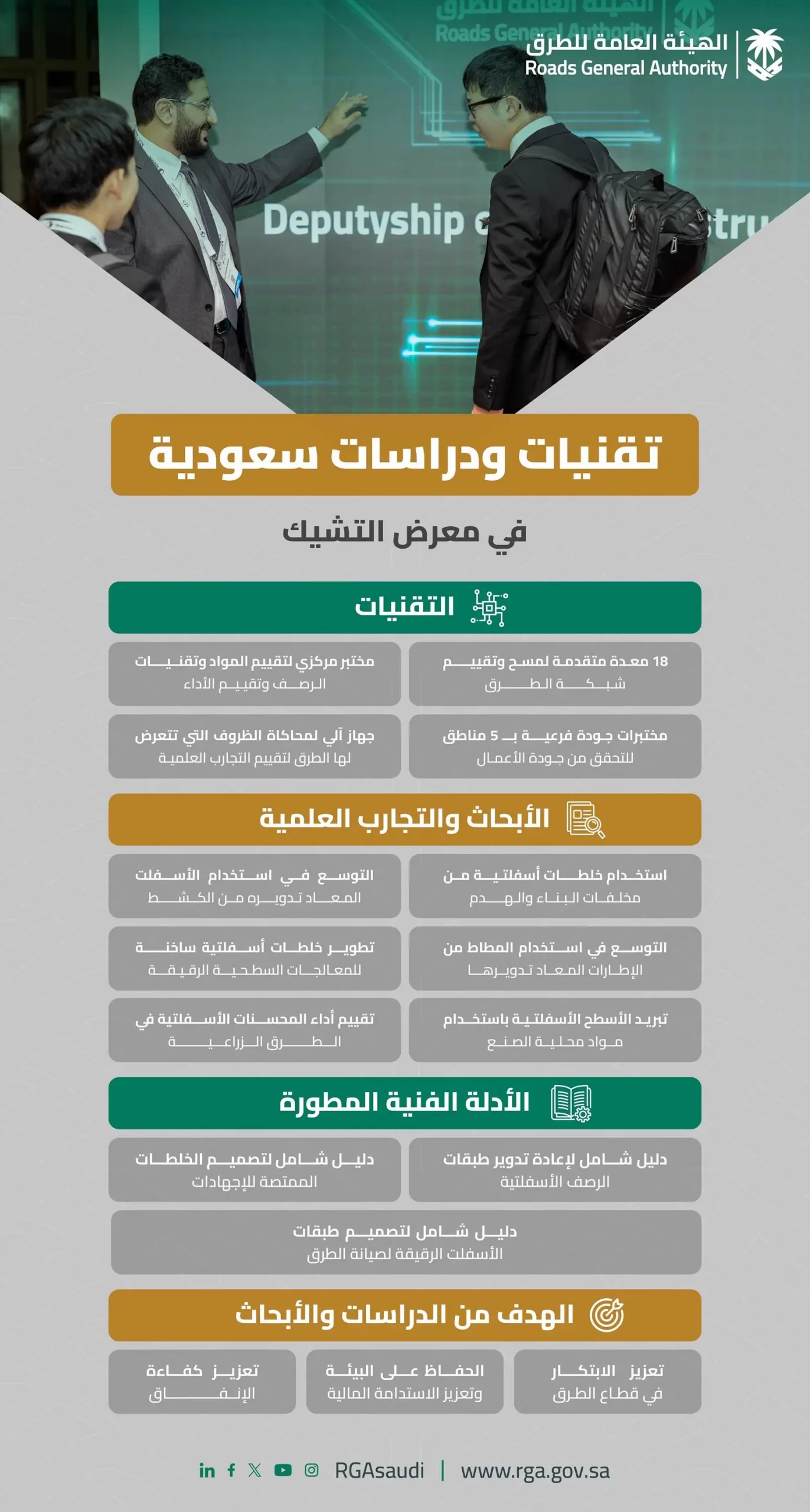 كما استعرضت الهيئة عدداً من الأدلة الفنية المطورة مثل الدليل الشامل لإعادة تدوير طبقات الرصف الأسفلتية، والدليل الشامل للخلطات الممتصة للإجهادات.