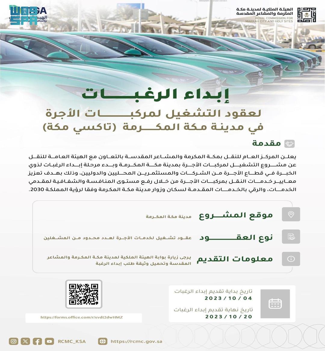 الهيئة الملكية لمكة المكرمة تُعلن عن مرحلة إبداء الرغبات لعقود تشغيل مركبات الأجرة