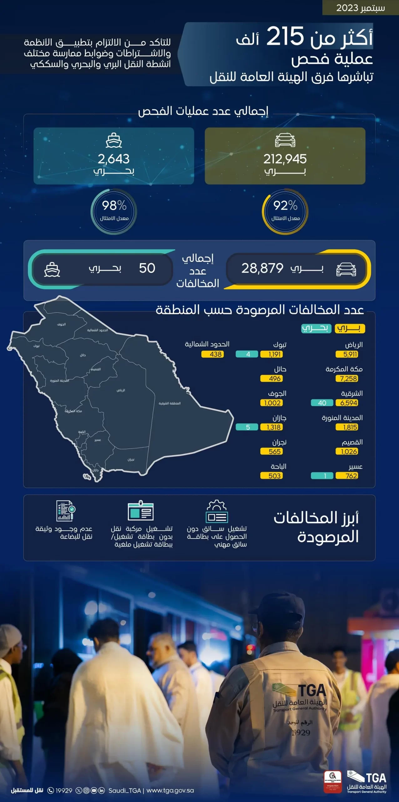 نفّذت الهيئة العامة للنقل ممثلةً بالإدارة العامة للرقابة وبالتعاون مع الجهات المعنية، حملات رقابية ميدانية خلال شهر سبتمبر، نتج عنها 212,945 عملية فحص في أنشطة النقل البري؛ منها 210,637 عملية فحص لمركبات النقل، و369 عملية فحص للمركبات الأجنبية.
