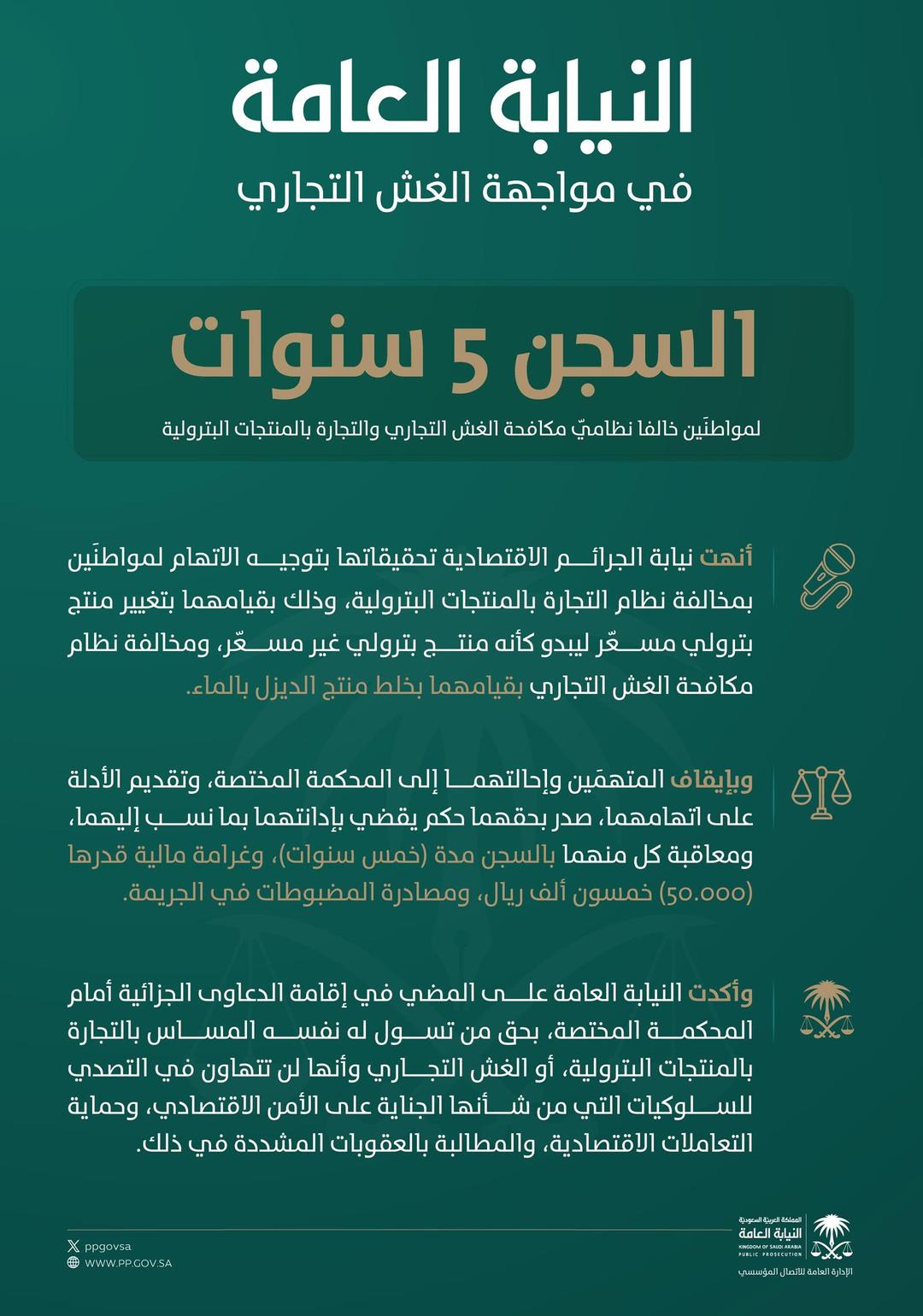 النيابة العامة: إدانة مواطنَين وسجنهما (5) سنوات وغرامة مالية لمخالفتهما نظاميّ مكافحة الغش التجاري والتجارة بالمنتجات البترولية