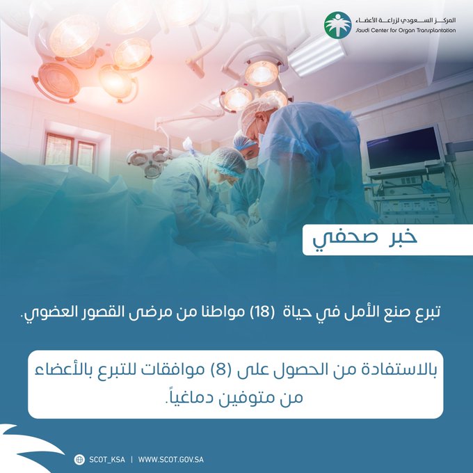 نجح فريق المركز السعودي لزراعة الأعضاء في الحصول على موافقات للتبرع بأعضاء ثمانية متوفين دماغياً لصالح مرضى القصور العضوي النهائي وذلك في مستشفى الملك خالد الجامعي، ومستشفى الدكتور محمد الفقيه ومدينة الملك سعود الطبية بالرياض، ومستشفى المانع بالهفوف ومستشفى الملك فهد بجدة بالإضافة إلى مستشفى كليفلاند في أبوظبي.
