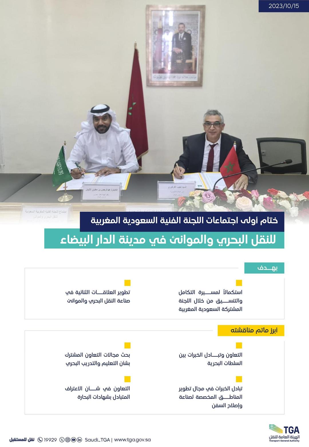 اختتمت اللجنة الفنية السعودية المغربية للنقل البحري والموانئ أعمال أولى اجتماعاتها المنعقدة في مدينة الدار البيضاء المغربية، برئاسة وكيل النقل البحري بالهيئة العامة للنقل الكابتن عبدالرحمن بن معتوق الثنيان، ومدير الملاحة البحرية المغربية نجيب الكركوري، بمشاركة ممثلين من وزارة الخارجية، والهيئة العامة للموانئ، وعدد من أعضاء اللجنة الفنية الممثلين من الجانب المغربي.