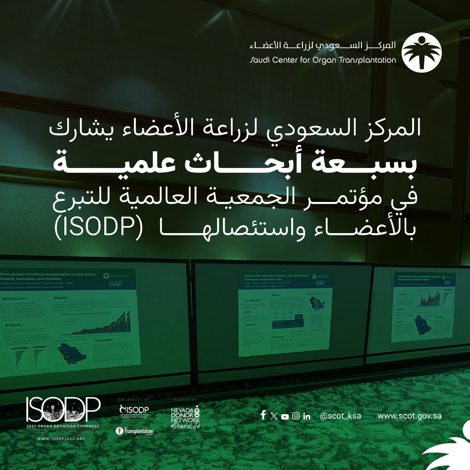 يشارك المركز السعودي لزراعة الأعضاء في المؤتمر العالمي لجمعية التبرع بالأعضاء واستئصالها (ISODP), الذي نُظم بالتعاون مع الجمعية العالمية لزراعة الأعضاء (TTS) في لاس فيغاس بالولايات المتحدة الأمريكية خلال الفترة من 18 إلى 22 أكتوبر 2023م.