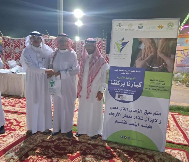 ضمن مبادرة شاركنا من أجل صحة مجتمعك والتي ينفذها مركز التنمية الاجتماعية بوادي فاطمة و برنامج مدينة الجموم الصحية بالتعاون مع بلدية محافظة الجموم والصحة بمكة المكرمة وشركاء النجاح أقامت جمعية التنمية الأسرية بمحافظة الجموم سعادتي الديوانية الأسرية (كبارنا بركتنا) لعام ١٤٤٥ و بحضور جمع من الآباء المتقاعدين وكذلك حضور بعض المسؤولين في الجهات المشاركة حيث أقيمت عدة فعاليات متنوعة ما بين الشعر والحداية والمحاورة والحوارات الأدبية وقصص الآباء الهادفة وفي نهاية الفعالية تم تكريم المشاركين من الآباء والمتقاعدين من قبل رئيس الجمعية الأستاذ : عايض اللقماني ومشاركة بعض المسؤولين في التكريم وفي نهاية اخذت الصور التذكارية مع المشاركين وفريق العطاء التطوعي الذي قام بالإشراف والإعداد لهذه الفعالية كما شكر رئيس الجمعية جميع المشاركين الذين ساهموا في إنجاح هذه الفعالية.