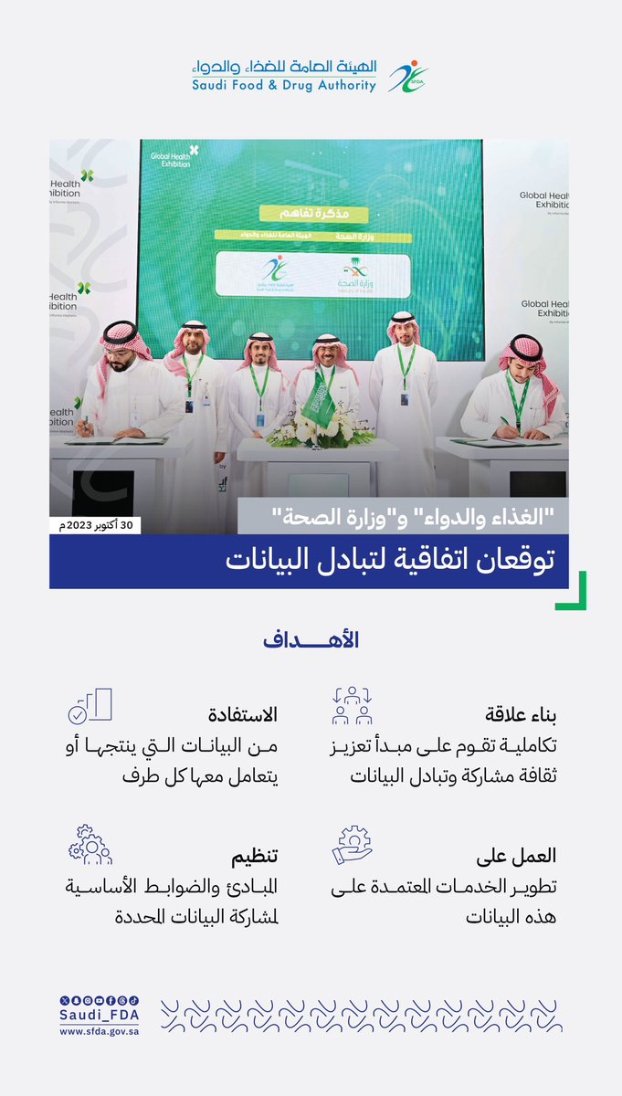 وقّعت الهيئة العامة للغذاء والدواء ووزارة الصحة اليوم الاثنين، في ملتقى الصحة العالمي 2023، اتفاقية لتبادل البيانات؛ بهدف تحقيق التكامل بين الطرفين.