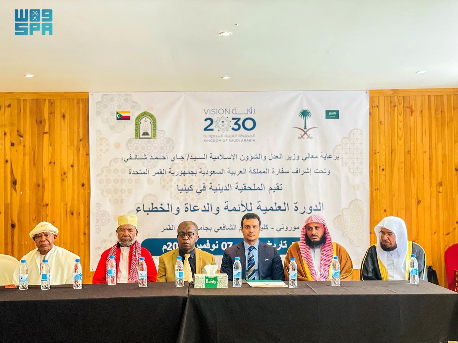 اختتمت وزارة الشؤون الإسلامية والدعوة والإرشاد، أمس, الدورة العلمية لتأهيل الأئمة والخطباء، في موروني عاصمة جمهورية القمر المتحدة، وذلك بحضور نائب سفير خادم الحرمين الشريفين لدى جمهورية القمر المتحدة وليد موصلي ووزير العدل والشؤون الإسلامية بجمهورية القمر المتحدة جاي أحمد شانفي ومفتي الجمهورية الشيخ أبو بكر سيد عبدالله جمل الليل.