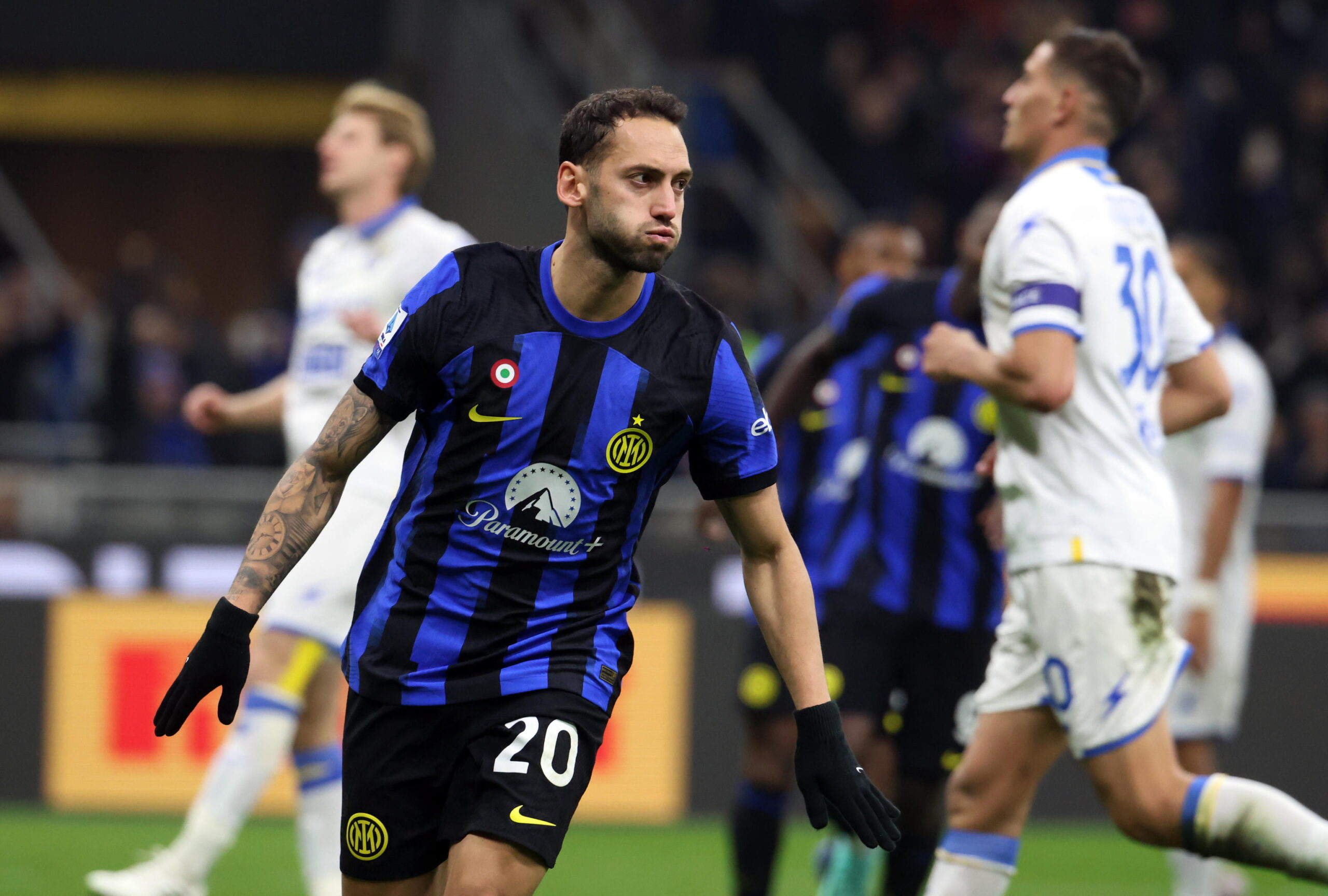 epa10972482 Inter Milan’s Hakan Calhanoglu celebrates after scoring the 2-0 goal from a penalty kick during the Italian Serie A soccer match between FC Inter Milan and Frosinone Calcio, in Milan, Italy, 12 November 2023. EPA/MATTEO BAZZI