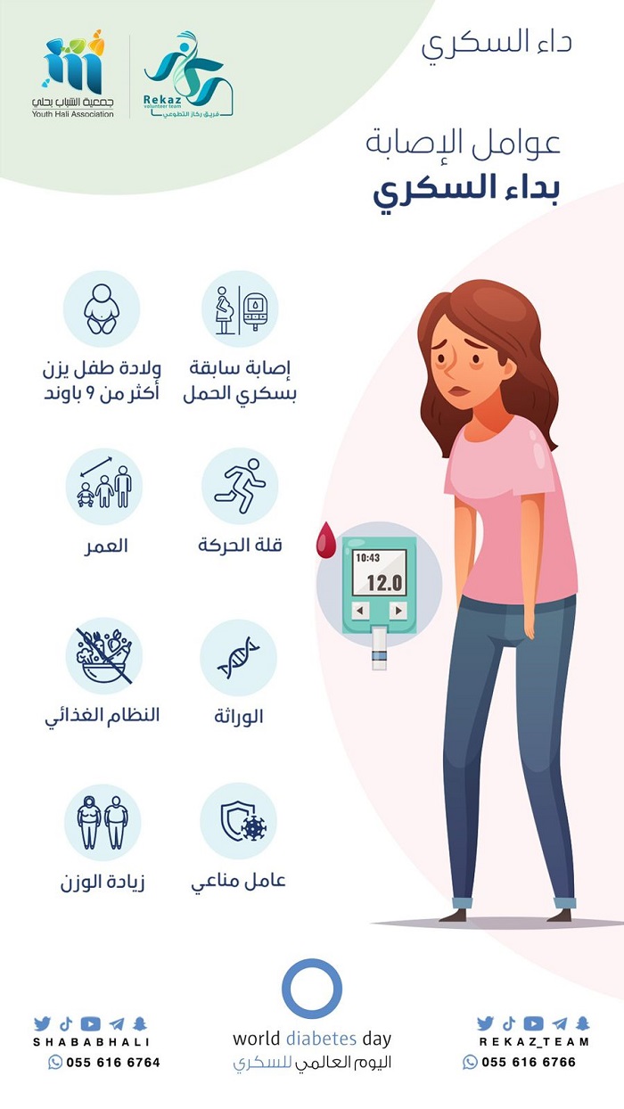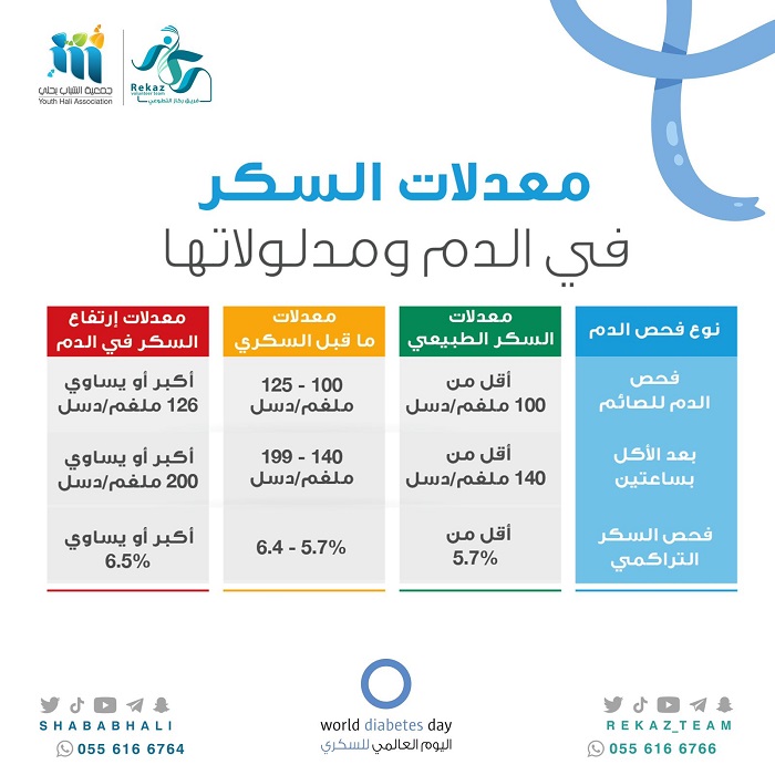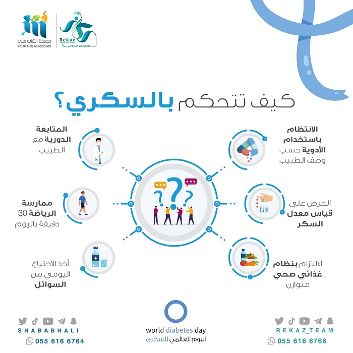 تزامنًا ‬⁩مع اليوم العالمي للسكري ‏شـاركت جمعية الشباب بحلي ممثلةً في فريق ركاز التطوعي‬⁩ بمبادرة “داء السكري وقاية وتعايش” بالتعاون مع المركز الصحي بالصفة حيث تعددت الفعاليات التوعوية والصحية من حيث المنشورات وقياس لمستوى السكر في الدم والنصائح الطبية والتوزيعات المناسبة واستهدفت المبادرة قرابة ٧٠ مستفيد ومستفيدة من عمر ٢٥ سنة إلى ٧٠ سنة هذا وقد بلغ عدد المتطوعات ٢٠ متطوعة والمشاركات ١٥ .‏