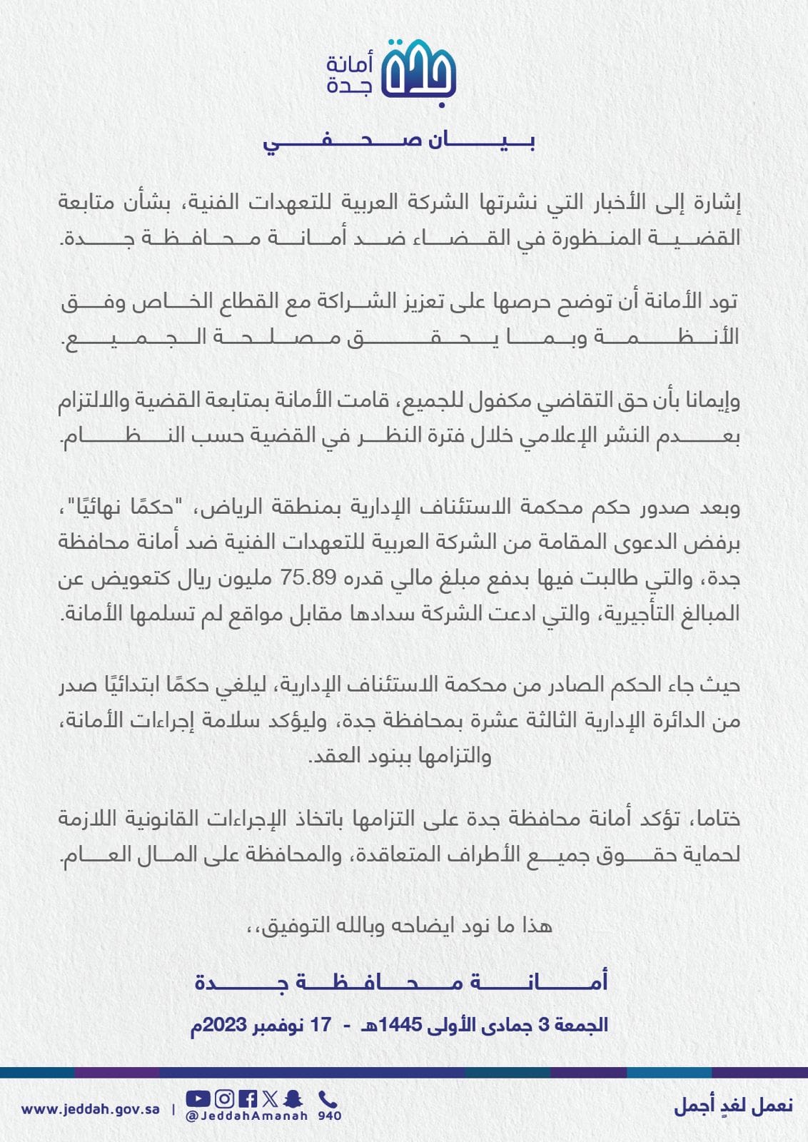 أصدرت أمانة محافظة جدة بيانًا بشأن الأخبار التي نشرتها الشركة العربية للتعهدات الفنية.