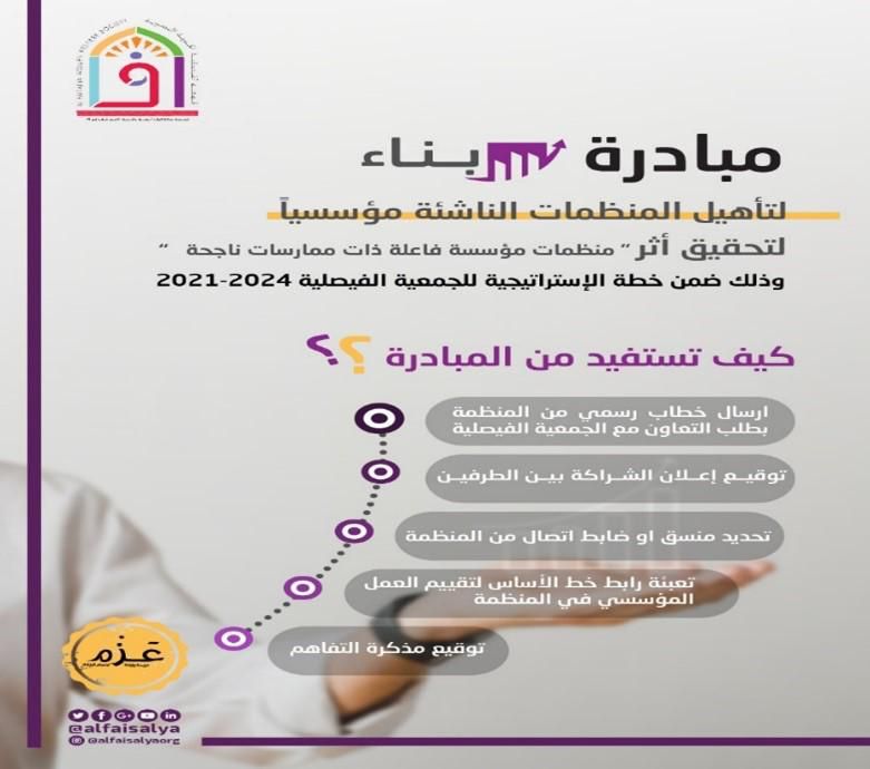 أطلقت الجمعية الفيصلية الخيرية النسوية بجدة وضمن خطتها الاستراتيجية “عزم” 2021-2024؛ مبادرة “بناء”؛ لتأهيل المنظمات الناشئة مؤسسياً؛ بهدف تأهيل منظمات التمكين الاجتماعي الاقتصادي؛ في إطار توظيف خبرة الجمعية وقدرتها على مدار 50 عاماً من العمل الخيري والتنموي؛ وذلك من خلال توظيف الإمكانيات البشرية والإدارية والفنية في دعم ومساندة هذا المنظمات من أجل تحقيق أثر “منظمات مؤسسة فاعلة ذات ممارسات ناجحة”.