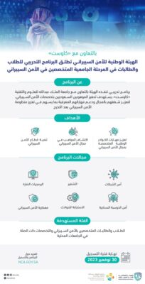 وأوضحت أن البرنامج يأتي انطلاقاً من أهدافها الإستراتيجية في تنمية قطاع الأمن السيبراني ورأس المال البشري للقيام بأدوار محورية وتلبية احتياجات سوق العمل في المملكة، ويستهدف الطلاب الموهوبين والمبدعين والمبتكرين في المرحلة الجامعية من كافة تخصصات الأمن السيبراني والتخصصات ذات الصلة في مختلف الجامعات في المملكة، لافتة إلى أن البرنامج يركز على المجالات التالية: (أمن الشبكات، التشفير، البرمجيات الضارة، أمن الحوسبة السحابية، الاستجابة للحوادث، معمارية الأمن السيبراني).