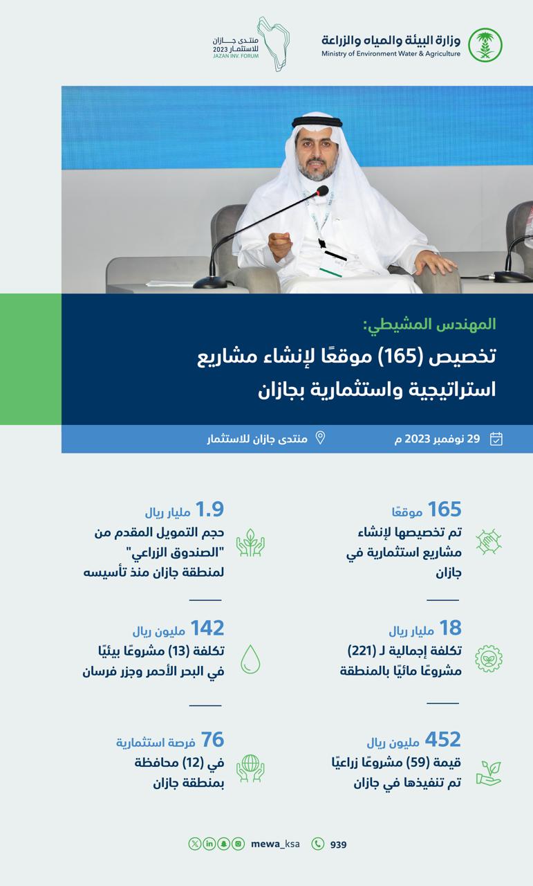 كشف معالي نائب وزير البيئة والمياه والزراعة المهندس منصور من هلال المشيطي، أن منظومة “البيئة” أكملت مشاريع في منطقة جازان، حيث بلغت تكلفة مشاريع المياه بأكثر من (18) مليار ريال لـ(221) مشروعًا، في حين بلغت تكلفة المشاريع الزراعية في المنطقة (452) مليون ريال لـ(59) مشروعًا، بالإضافة إلى (142) مليون ريال في مجال البيئة لـ(13) مشروعًا، موضحًا بأن الوزارة تعمل على تنفيذ ووضع حجر الأساس لمشاريع جديدة تقدر قيمتها بـ(1.7) مليار ريال.