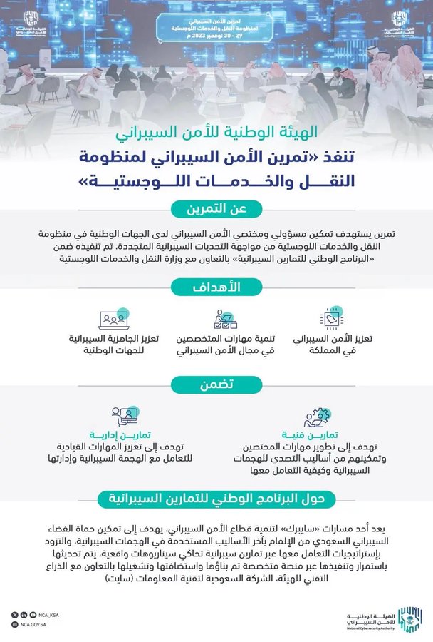 وبينت أن تمرين الأمن السيبراني لمنظومة النقل والخدمات اللوجستية، يأتي ضمن البرنامج الوطني للتمارين السيبرانية الذي أطلقته لتمكين حماة الفضاء السيبراني السعودي من الإلمام بآخر الأساليب المستخدمة في الهجمات السيبرانية، والتزود بإستراتيجيات التعامل معها عبر تمارين سيبرانية تُحاكي سيناريوهات واقعية يتم تحديثها باستمرار وتنفيذها عبر منصة متخصصة، تم بناؤها واستضافتها وتشغيلها محلياً بالتعاون مع الذراع التقني للهيئة، الشركة السعودية لتقنية المعلومات (سايت).