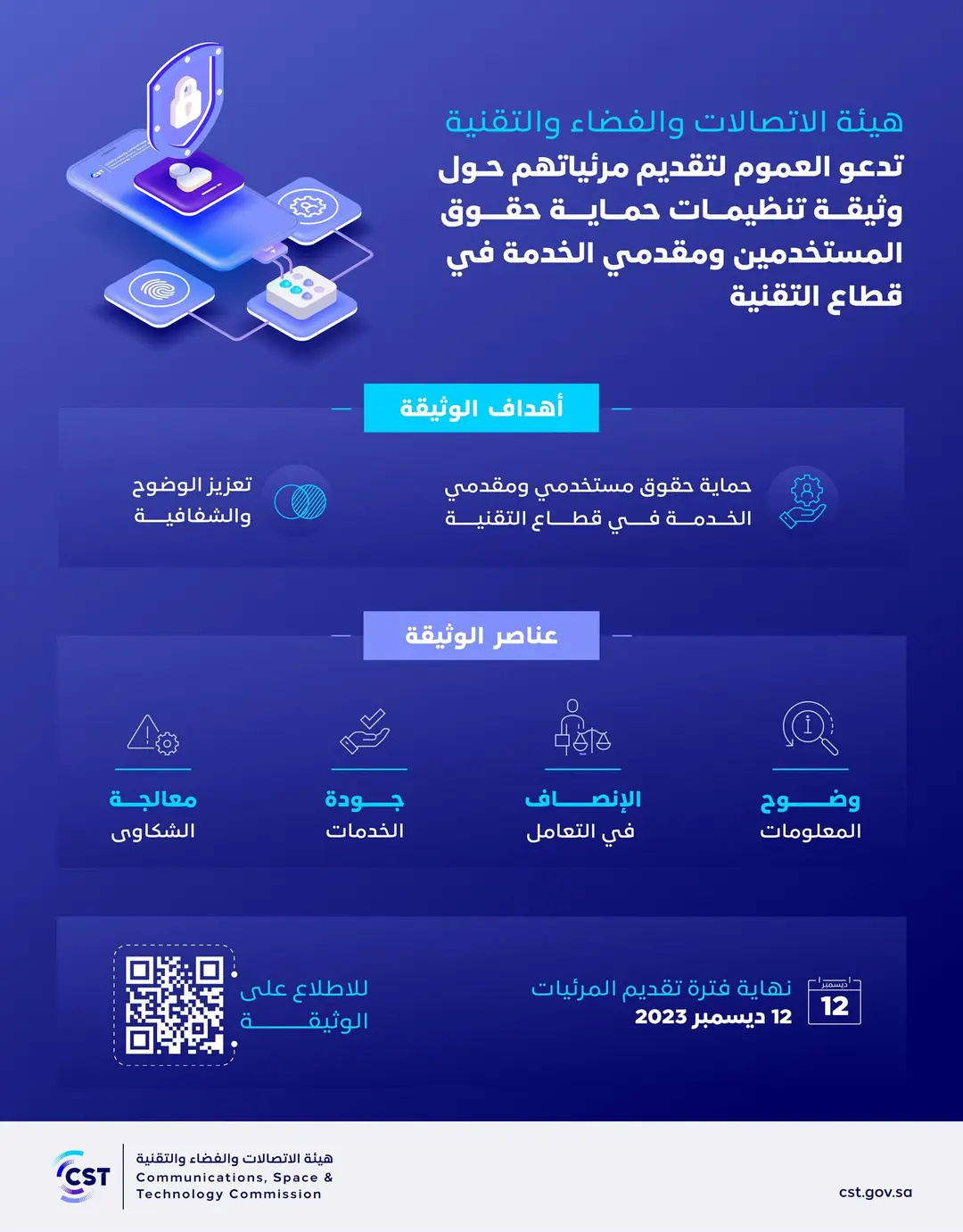 هيئة الاتصالات والفضاء والتقنية تدعو العموم لتقديم مرئياتهم حول وثيقة تنظيمات حماية حقوق المستخدمين ومقدمي الخدمة في قطاع التقنية