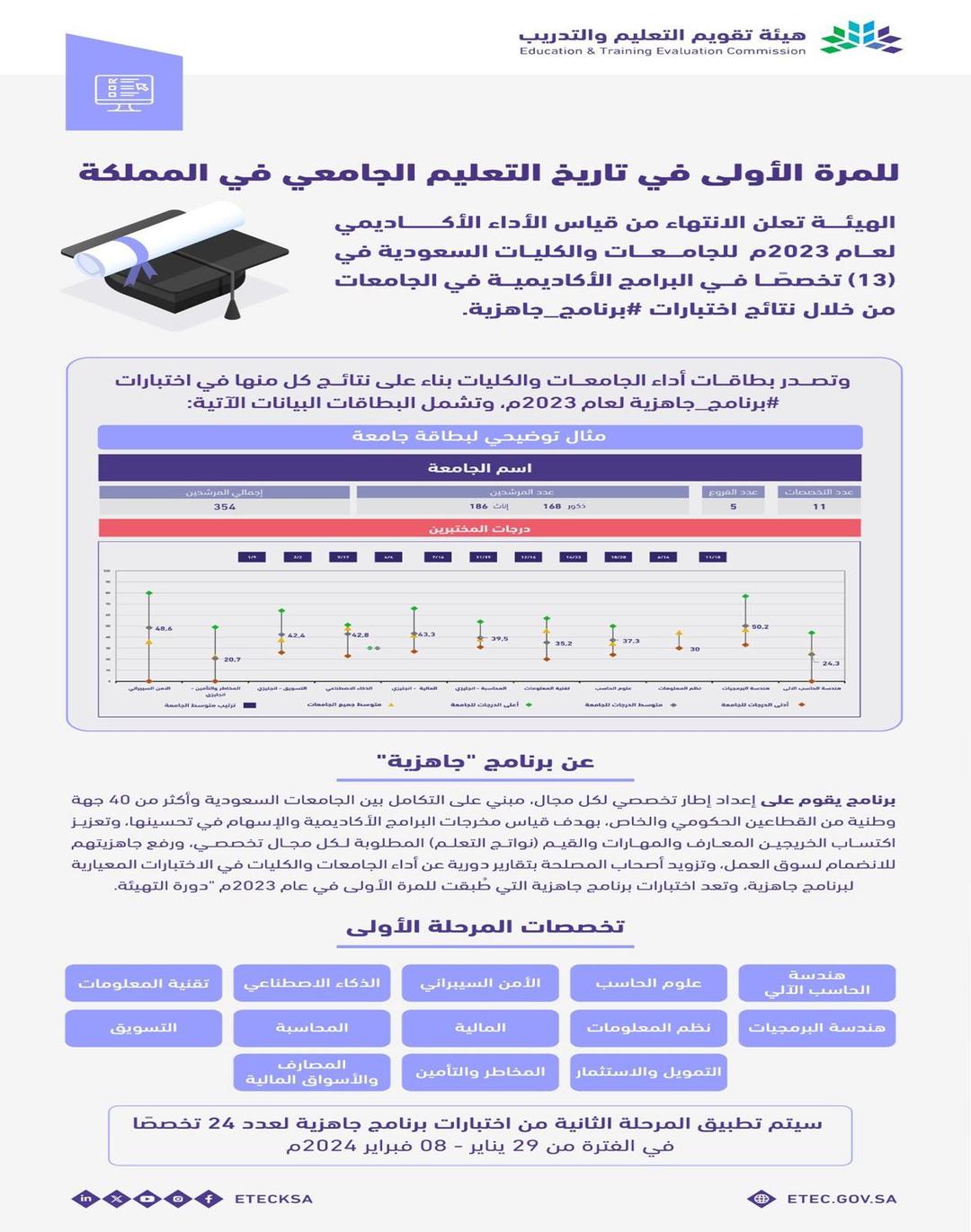 وشملت الاختبارات المعيارية لهذا العام 13 تخصصًا جامعيًّا، هي: (المالية، والمحاسبة، والتسويق، والتمويل والاستثمار، والمخاطر والتأمين، والمصارف والأسواق المالية، وهندسة الحاسب الآلي، وعلوم الحاسب، وهندسة البرمجيات، ونظم المعلومات، وتقنية المعلومات، والأمن السيبراني/ أمن المعلومات، الذكاء الاصطناعي.