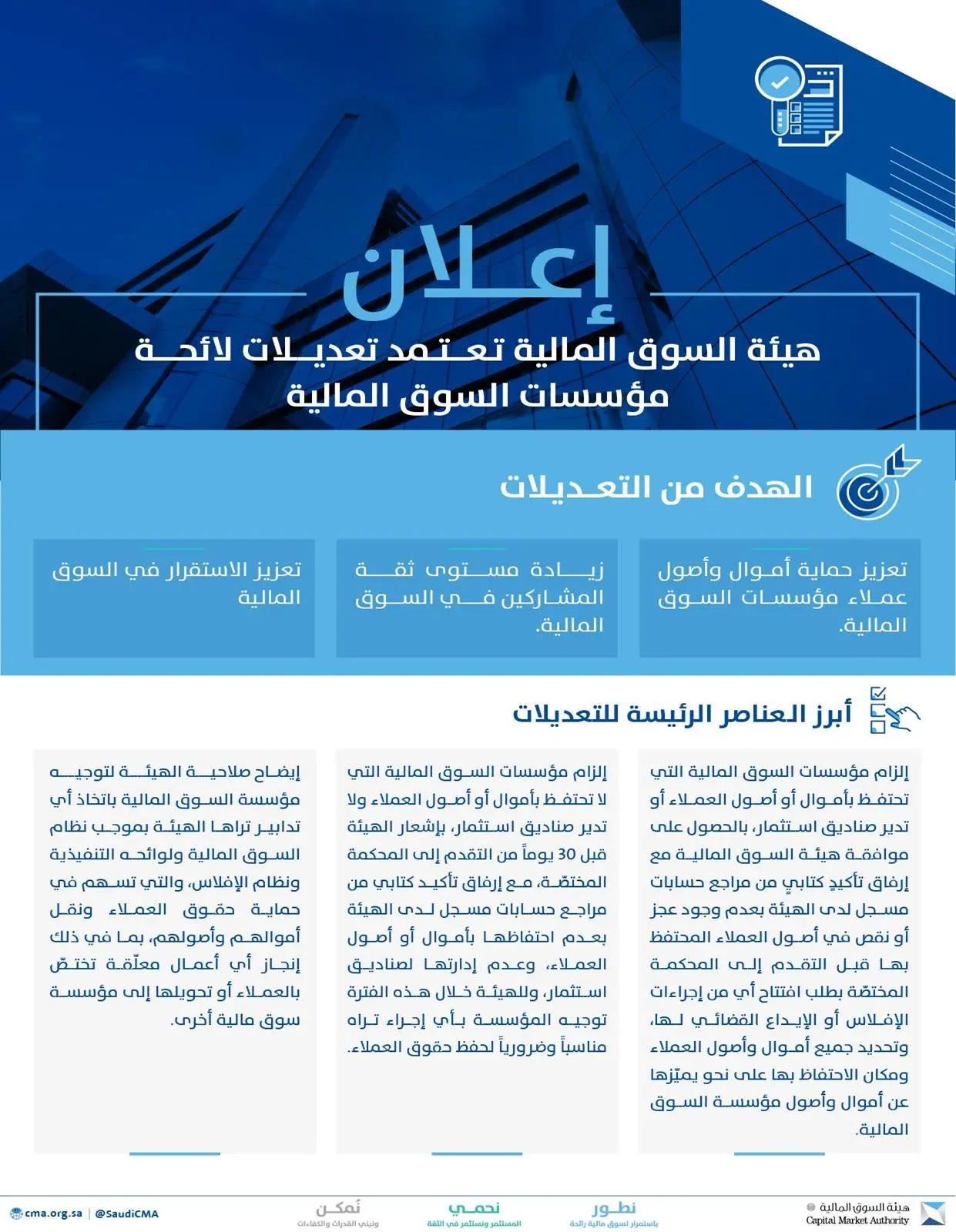 وأوضحت التعديلات التي جرى اعتمادها، الصلاحية لهيئة السوق المالية في توجيه مؤسسة السوق المالية باتخاذ أي تدابير تراها الهيئة ضرورية بموجب نظام السوق المالية ولوائحه التنفيذية ونظام الإفلاس، التي تسهم في حماية حقوق العملاء ونقل أموالهم وأصولهم، بما في ذلك إنجاز أي أعمال معلّقة تختصّ بالعملاء أو تحويلها إلى مؤسسة سوق مالية أخرى.